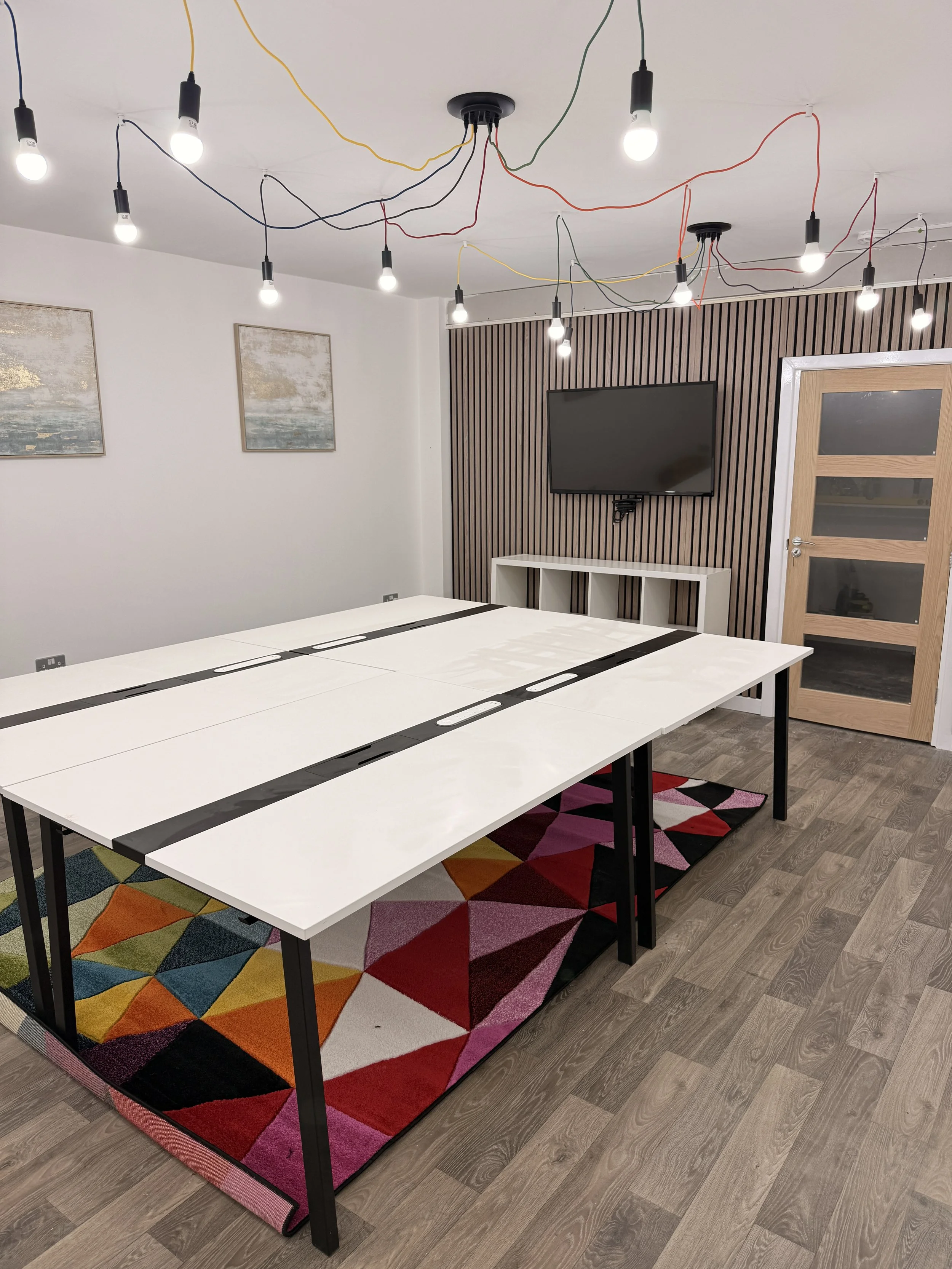 Our meeting space is large enough for 12 people and includes a whiteboard and a large screen.